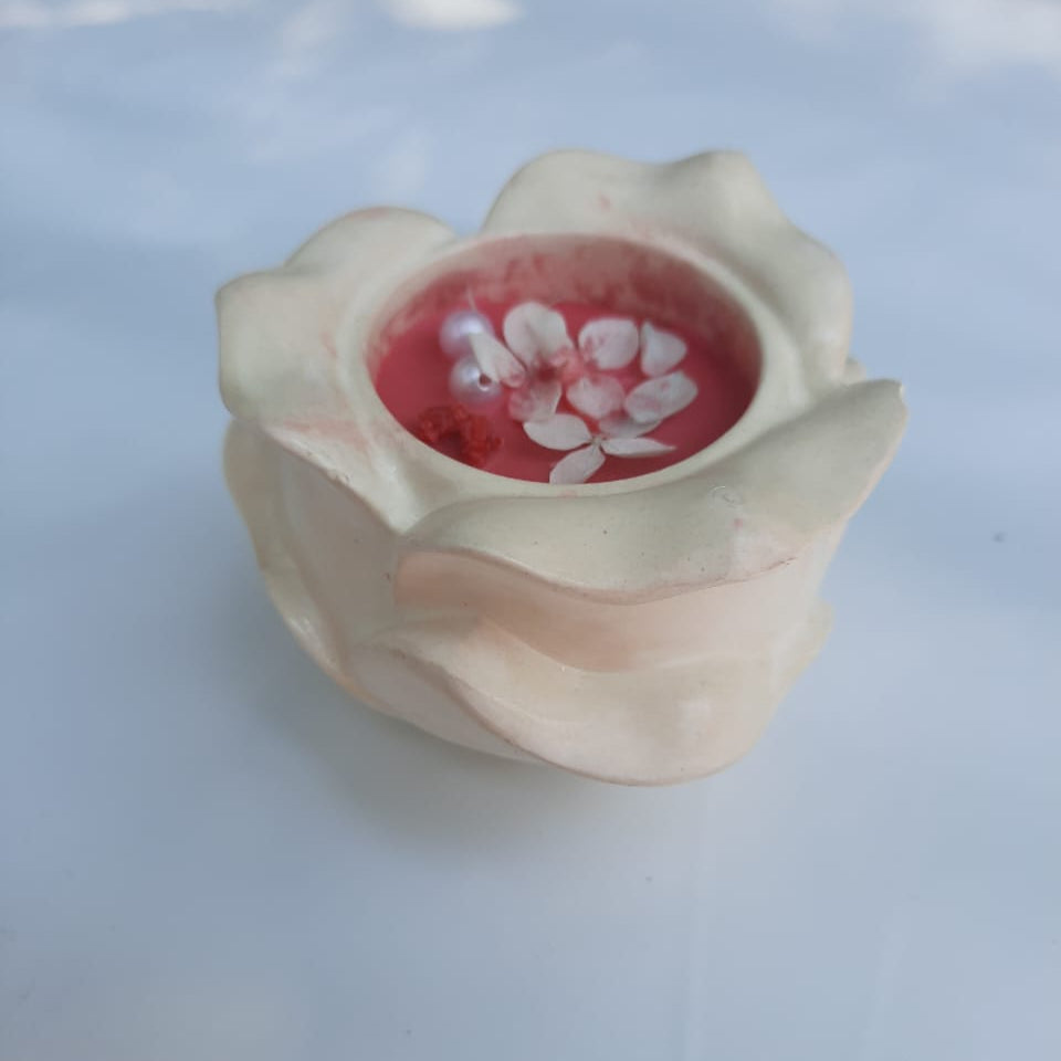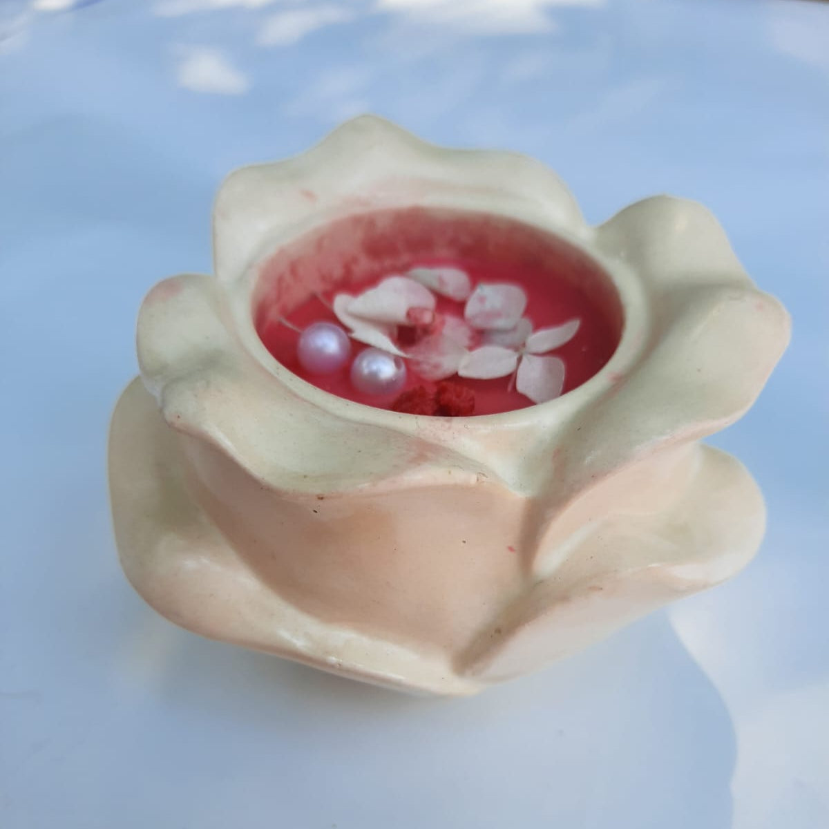ring elegance and tranquility to your space with our Petal Radiance Floral Candle. Hand-poured into a beautifully sculpted ceramic holder shaped like a blooming flower, this candle is more than just a source of light—it's a decorative statement. The soft pink wax is delicately adorned with dried petals and faux pearls, creating a serene and luxurious aesthetic. Perfect for home décor, special occasions, or gifting, this candle offers a gentle, soothing ambiance that calms the senses and beautifies any room.