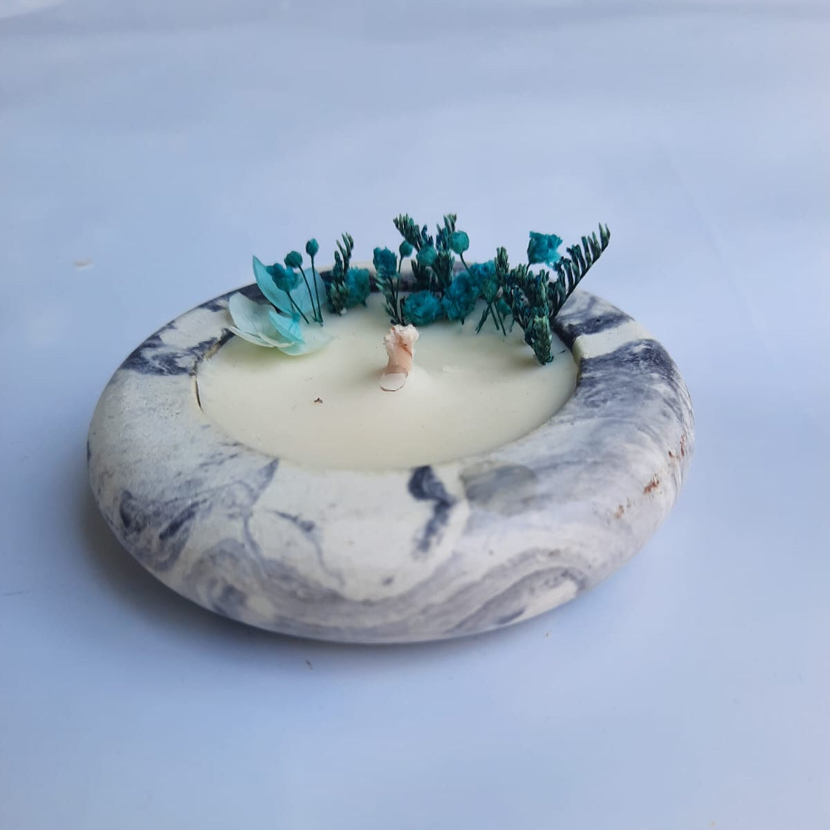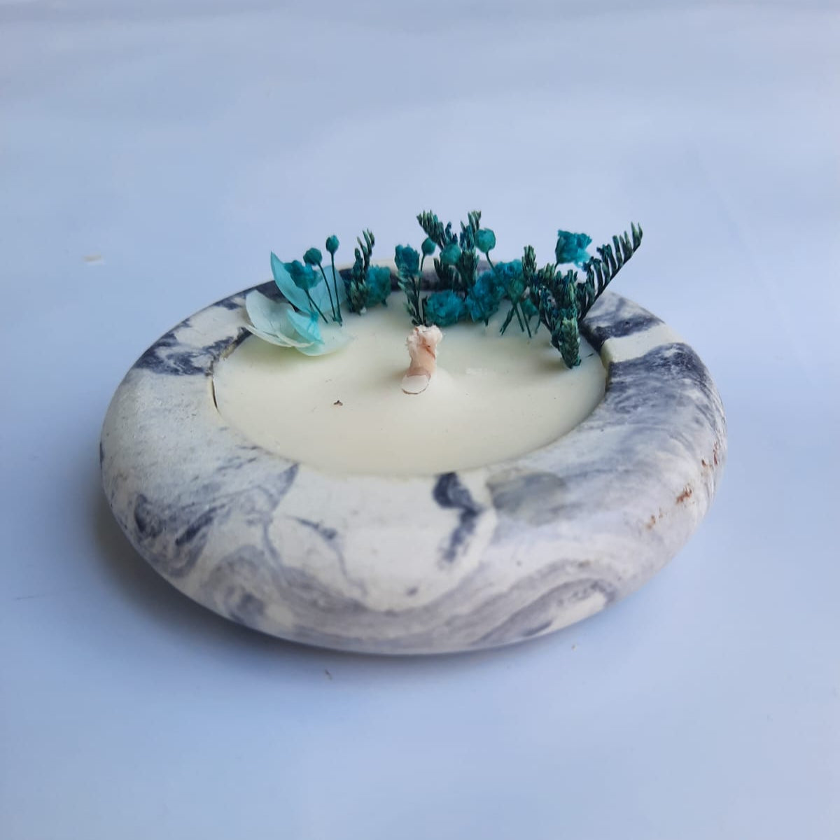 Bring the serenity of ocean breeze and modern elegance into your space with the TideStone Candle. Nestled in a marbled, handcrafted base, this soy wax candle is adorned with dried teal botanicals — evoking a coastal calm and minimalist beauty.